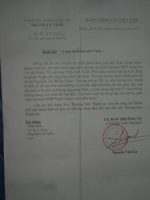 (4-5 tháng nay tôi viết và gửi rất nhiều đơn thư đến Thành Uỷ - UBKT Thành Uỷ các Sở và cơ quan hữu quan Bộ ban ngành, kể cả Bộ Chính trị - cục phòng chống tham nhũng, nhưng nay chỉ mới nhận được thông tin từ: Ban phòng chống tham nhũng và CA Nghệ An (đã về họp tại trường CĐSP - NA) và mới đây là của Thanh Uỷ - Vinh.